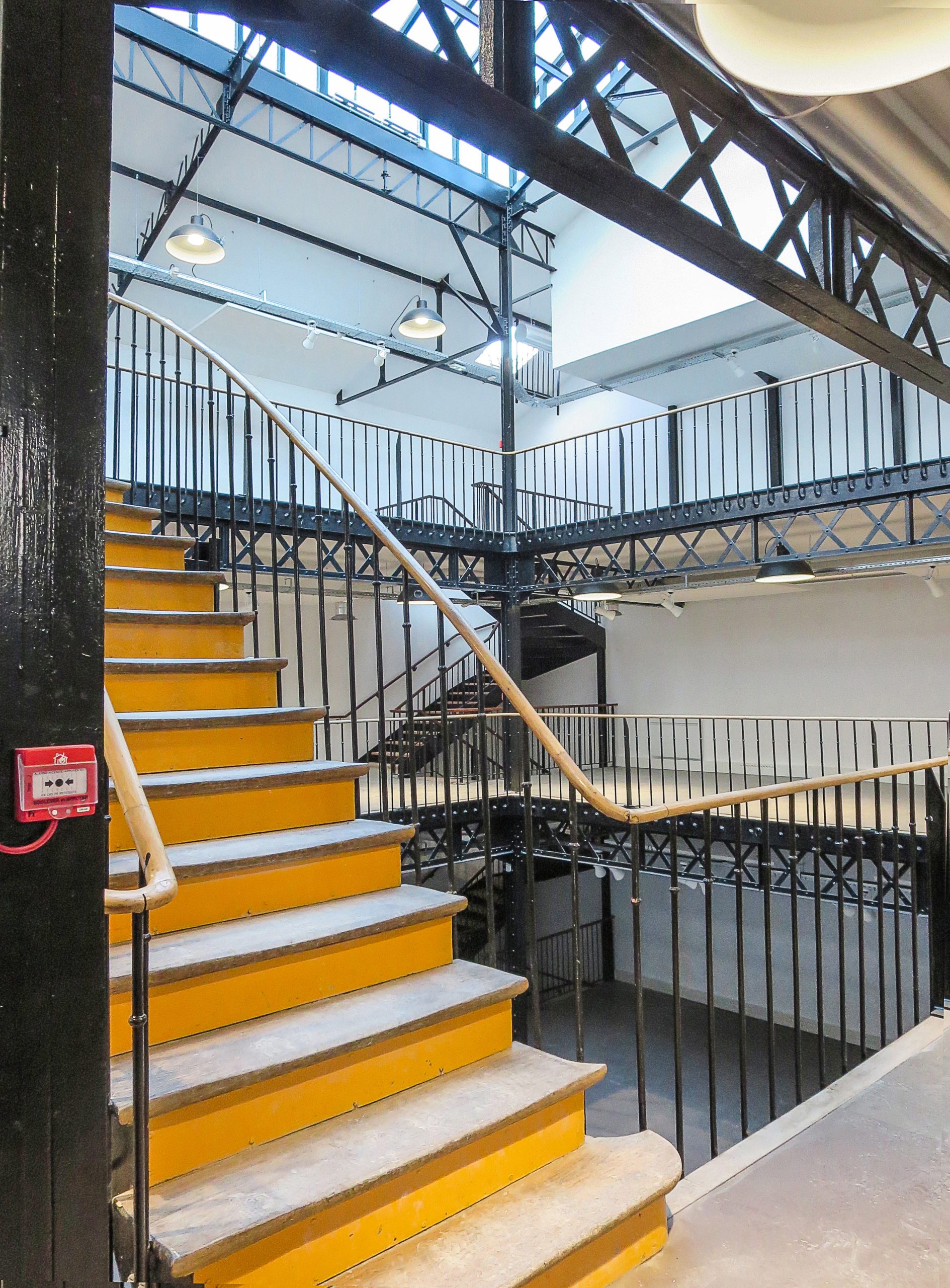 Le bâtiment B, par lequel on accède par les parties communes du bâtiment A, est l’ancienne manufacture. Il comprend un sous-sol, un rez-de-chaussée, s’ouvrant sur le R+1 et le R+2 composés de coursives, et sur une verrière en toiture. C’est un atrium couvert ouvert de type Eiffel, dont la façade principale est constituée de briques avec modénatures. La cour couverte par une terrasse relie ces deux corps de bâtiment. Notre mission a été de réhabilitée cette ancienne manufacture en espace de Co-working. L’étude a été mené dans un but de densification de cet ensemble afin d’offrir maximum de poste de travail dans les espaces partagés comme pour les bureaux individuels. Dès la conception, les contraintes architecturales et techniques liées à un ERP ont été essentielles. Une restructuration totale de l’ensemble était obligatoire se dotant ainsi de nouveaux escaliers pour permettre cette réorganisation des flux.